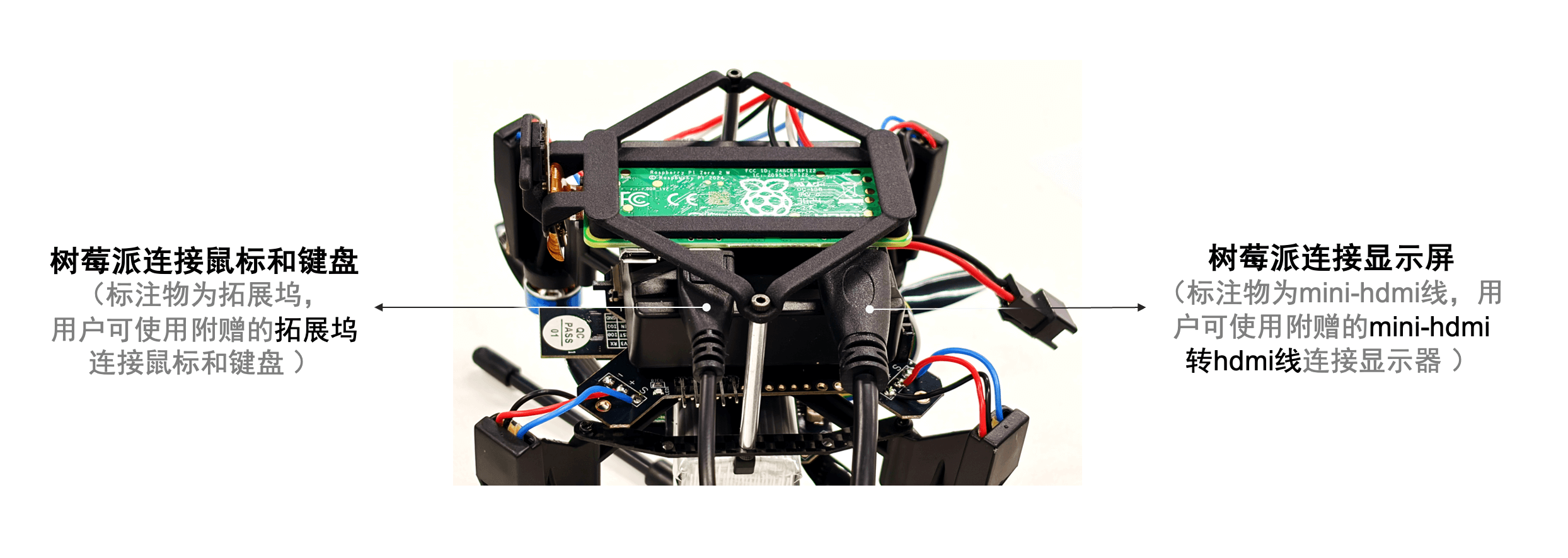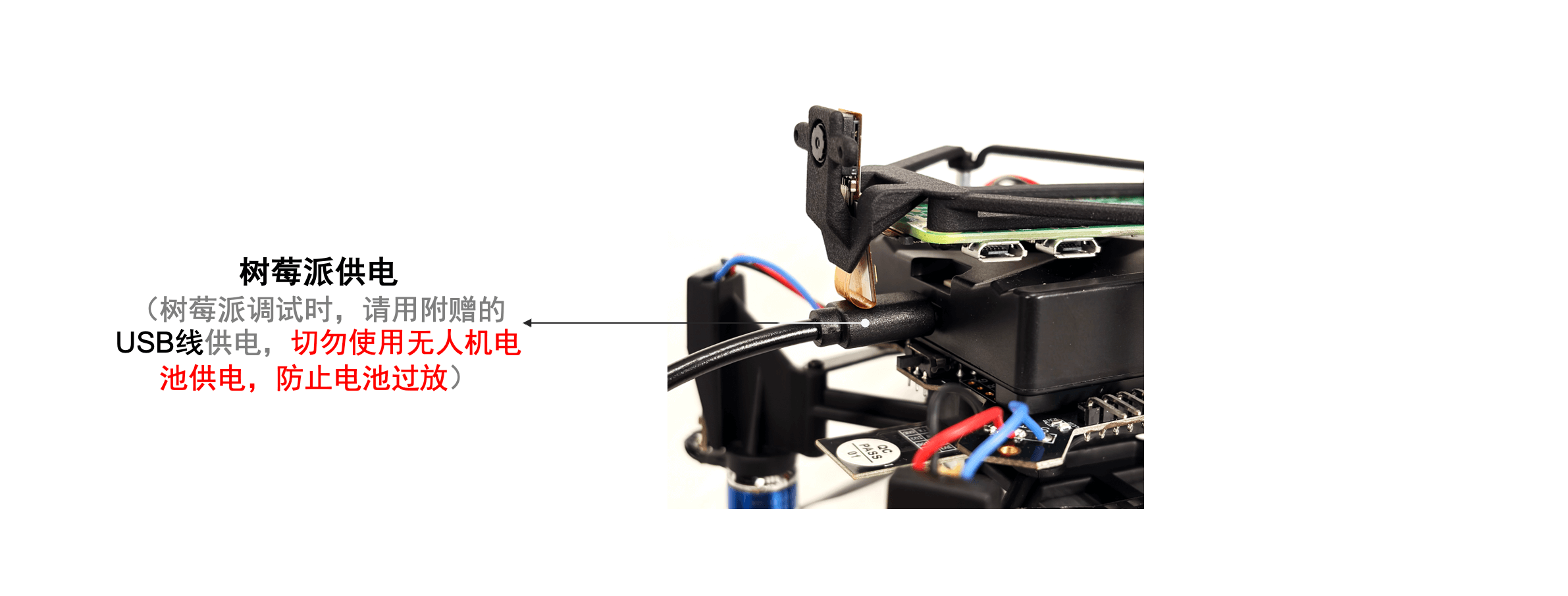 注:无人机静态调试时,请用USB线为飞控供电,切勿用无人机电池供电,防止电池过放,如下图所示: