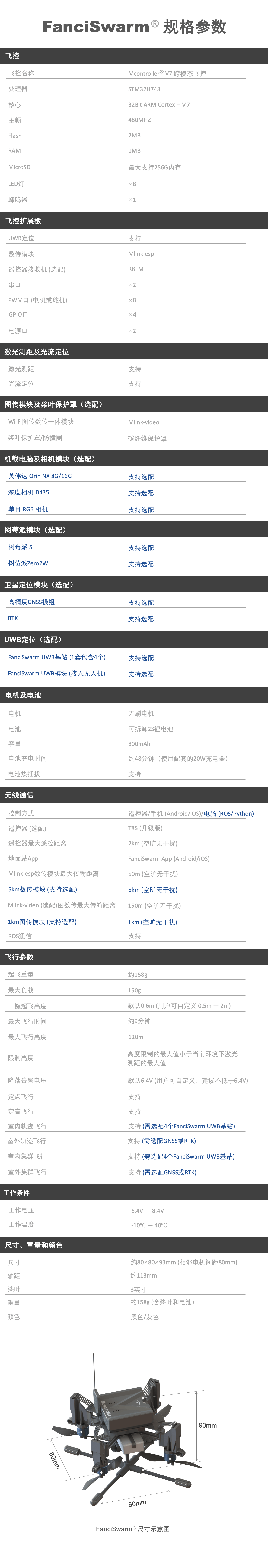 FanciSwarm™是一款基于全自研的Mcontroller®跨模态飞控(点击查看)开发的多功能微型集群无人机,专门用于集群、教育和科研。它可能是全球最小的无刷动力微型集群无人机,其搭载了超宽带(UWB)芯片,软件开源,硬件留有多个拓展接口,支持ROS开发/二次开发,配备了高性能无刷电机,相邻电机间距仅80mm,虽然整机大小不如成年人一只手掌大,但是却有最大150g的额外负载能力。