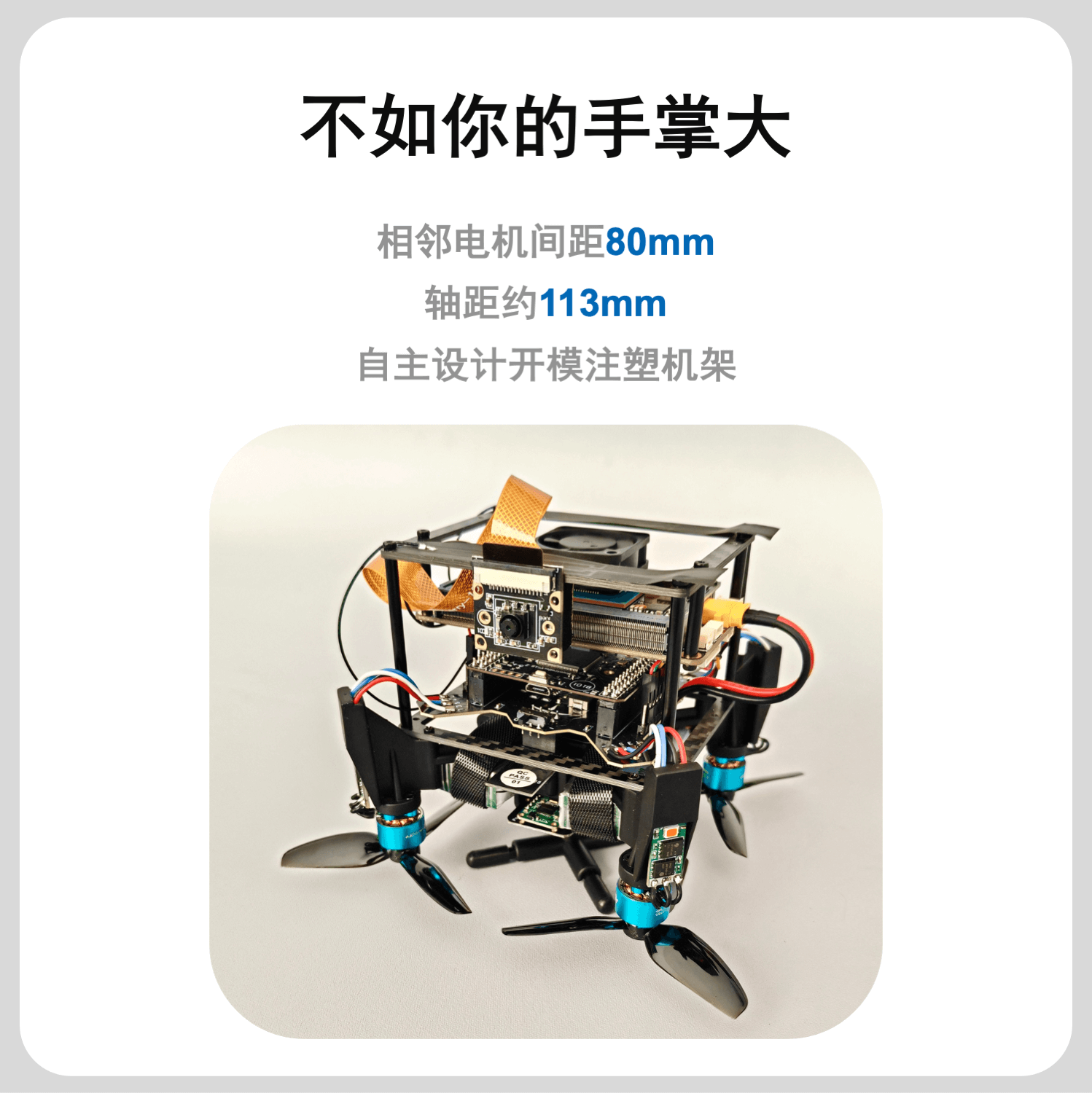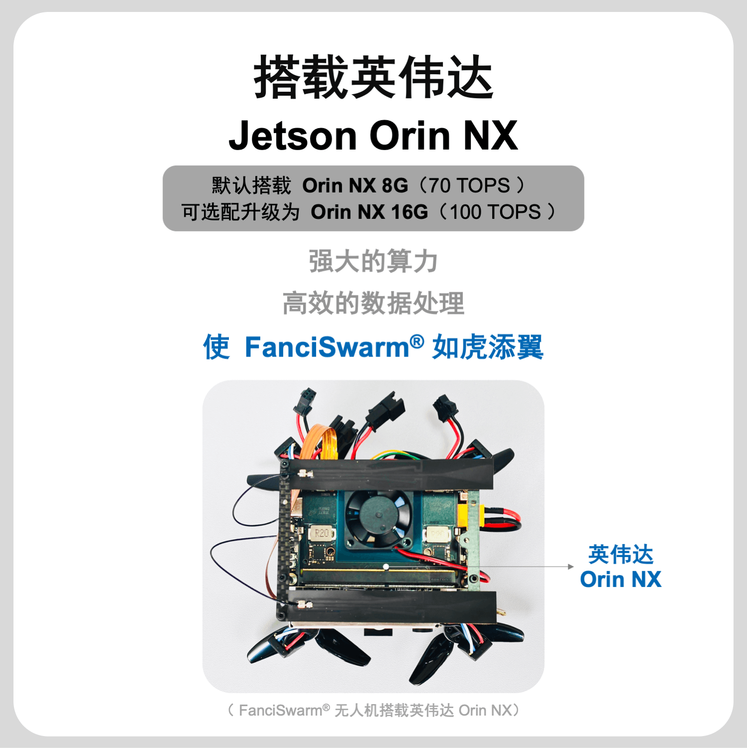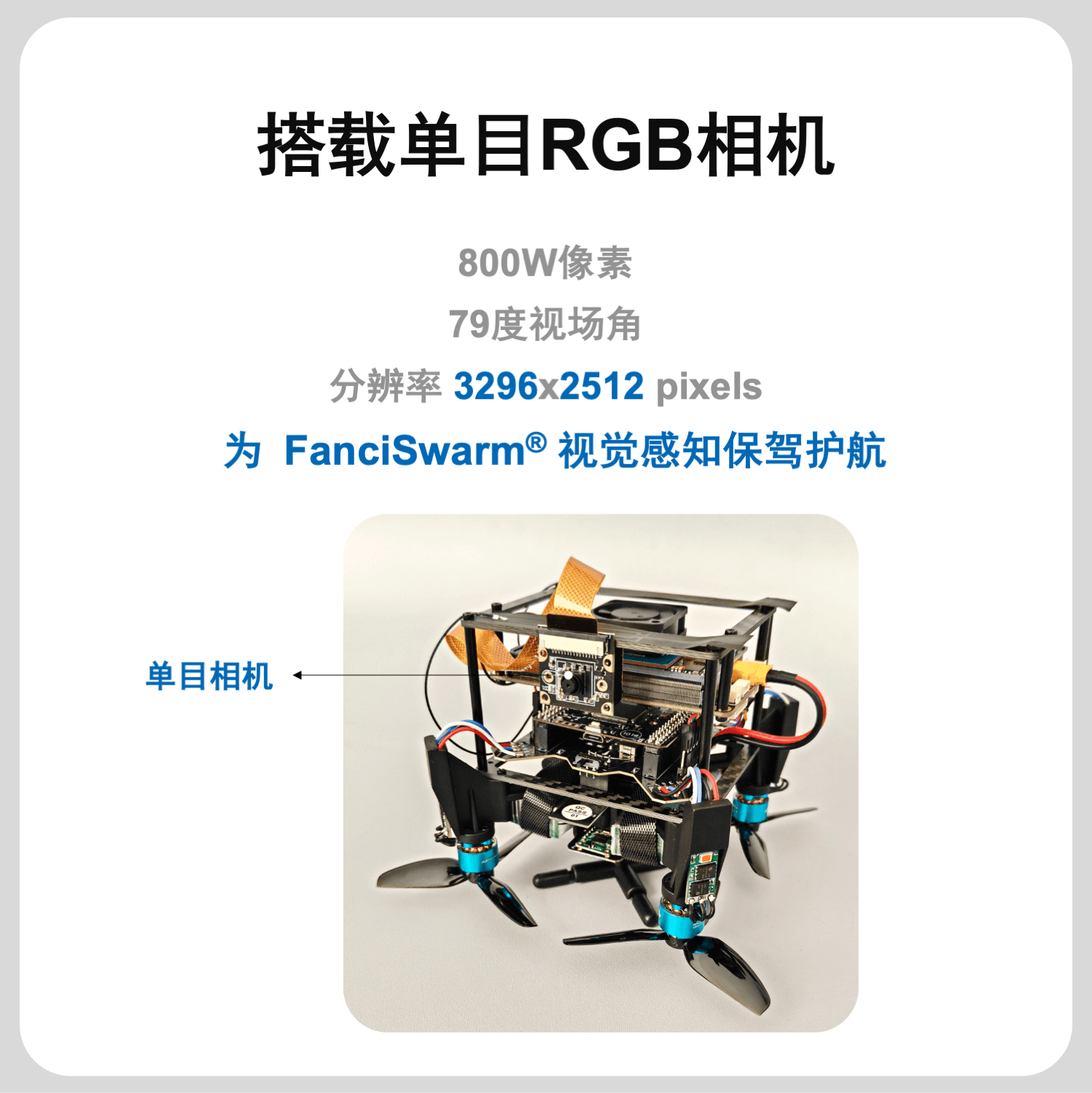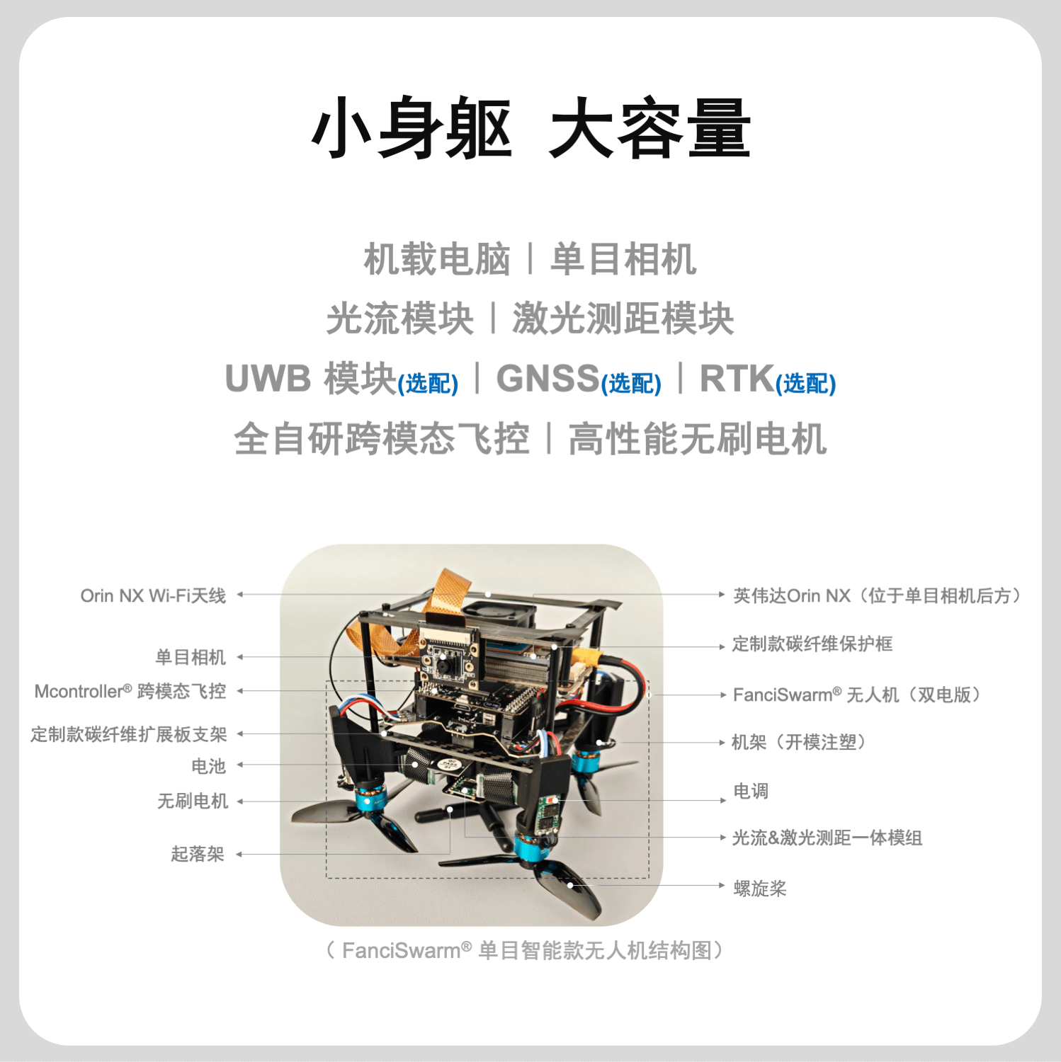 是什么?FanciSwarm® 单目视觉无人机套件是 FanciSwarm® 微型集群无人机技术的延伸,通过创新的机载电脑支架系统,实现与 NVIDIA Jetson Orin 系列的无缝集成,支持搭载 Orin NX 和 Orin Nano,赋予无人机强大的计算能力。