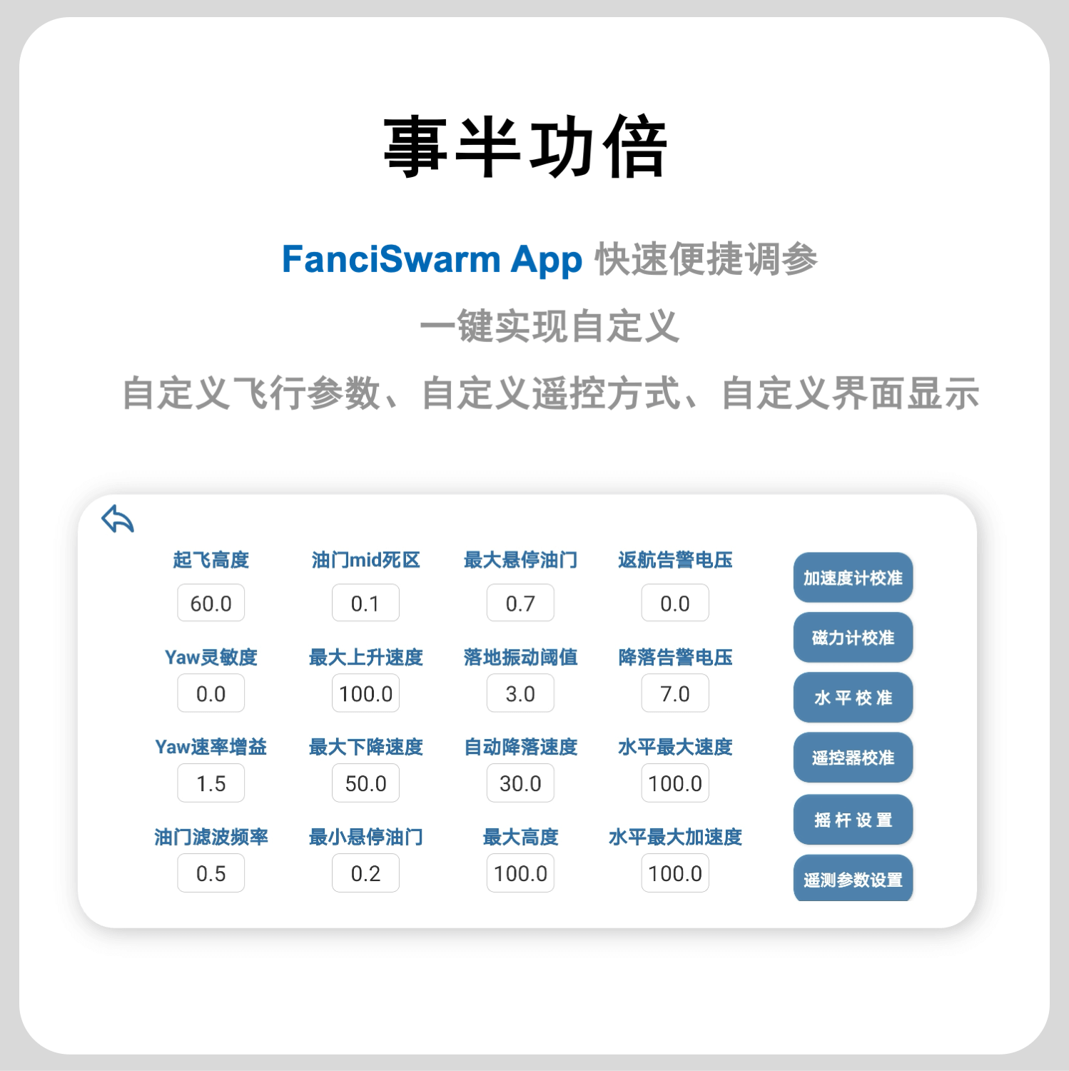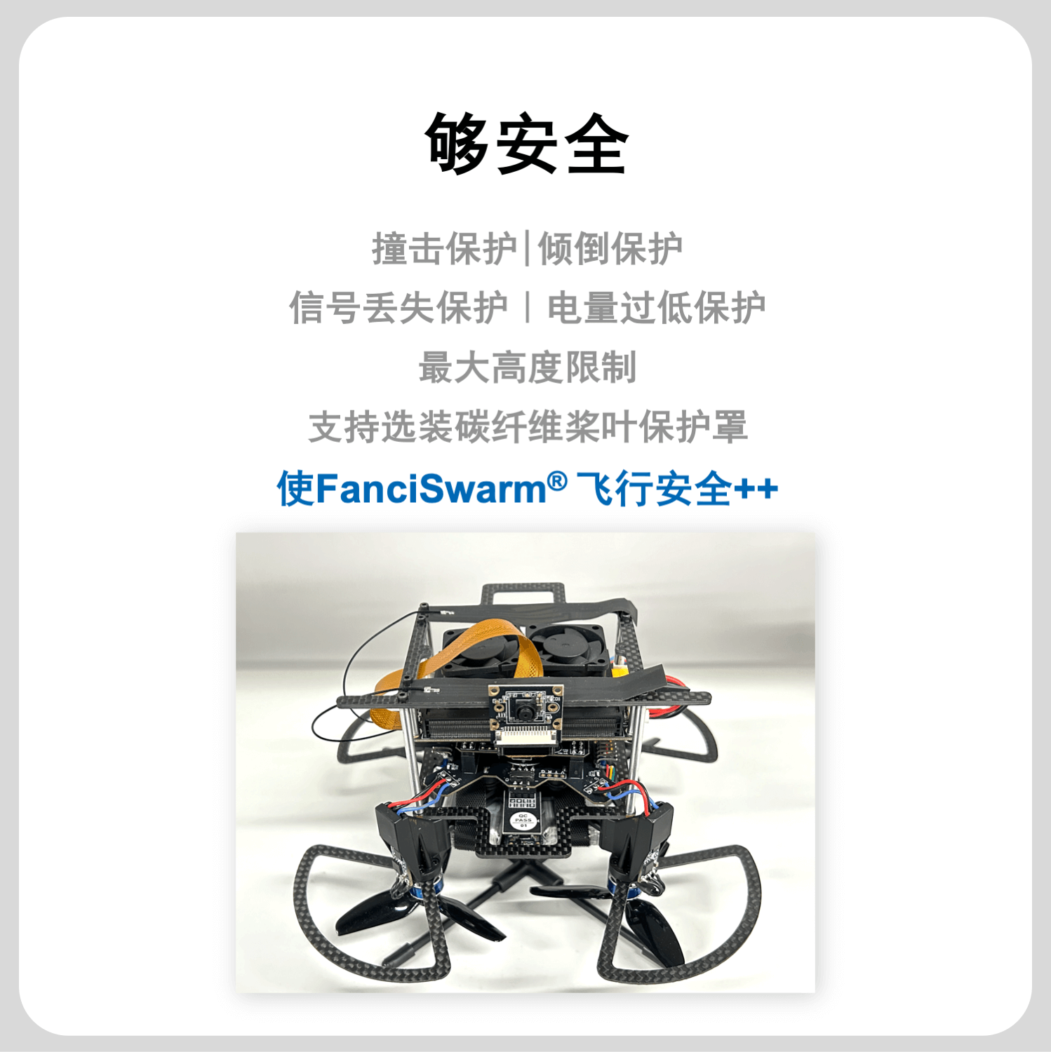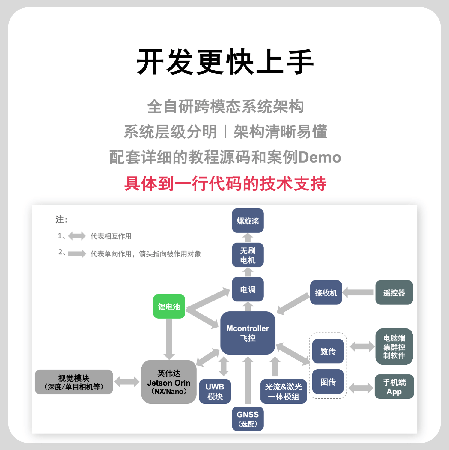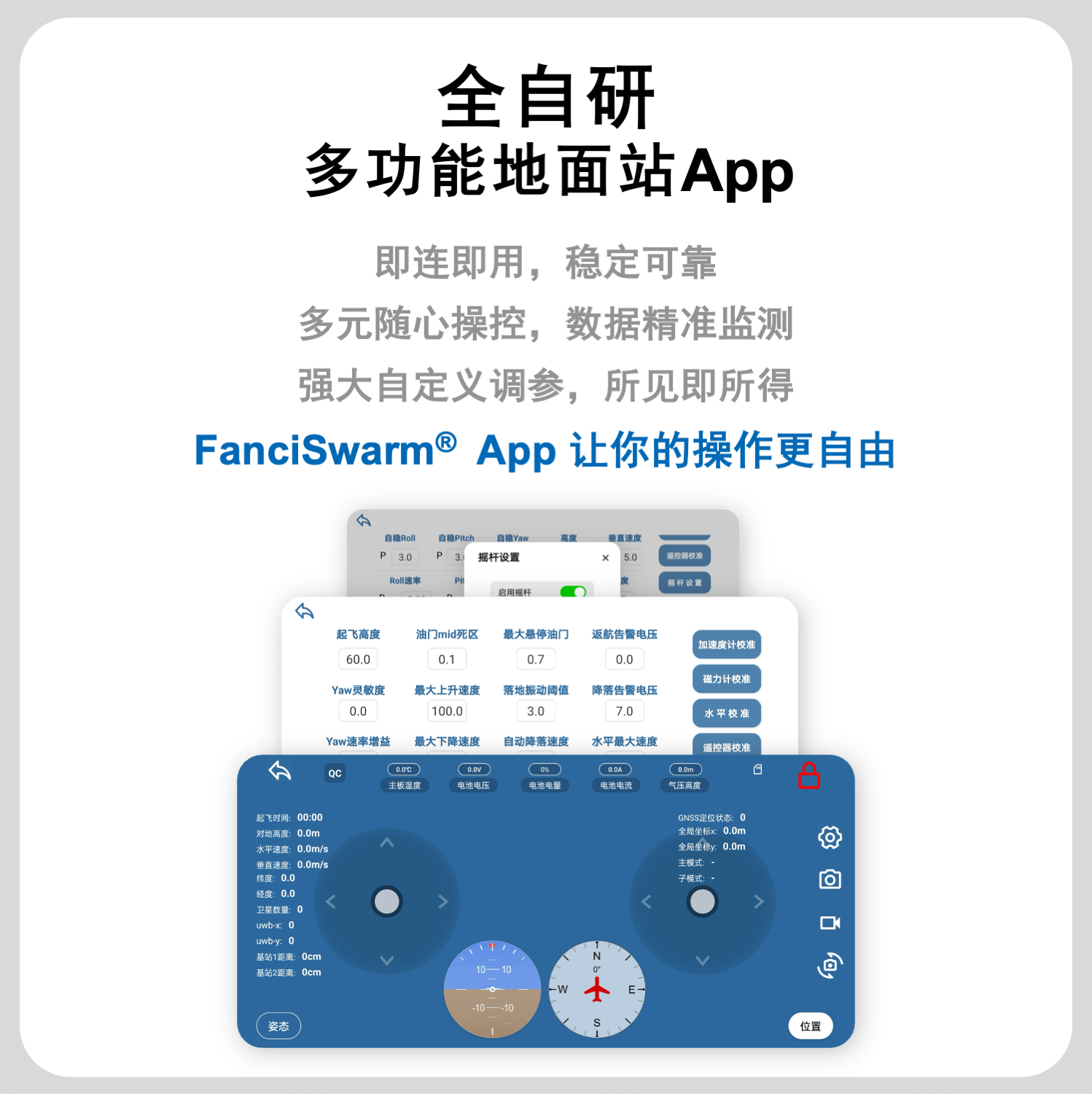 作用:FanciSwarm® 单目视觉套件,通过深度融合 Jetson Orin 的强大计算能力和 单目相机的环境感知能力,可实现图像识别、目标检测与跟踪、Aruco 码视觉引导精准降落、高精度导航与视觉定位(需选配深度相机)、视觉避障(需选配深度相机)、复杂场景下的路径规划和自主飞行(需选配深度相机)等功能,可胜任智能巡检、智能跟随、环境监测等多种应用场景。 此外, 搭配四个UWB基站,可实现高精度UWB定位,支持多机轨迹飞行、编队飞行和集群飞行。
