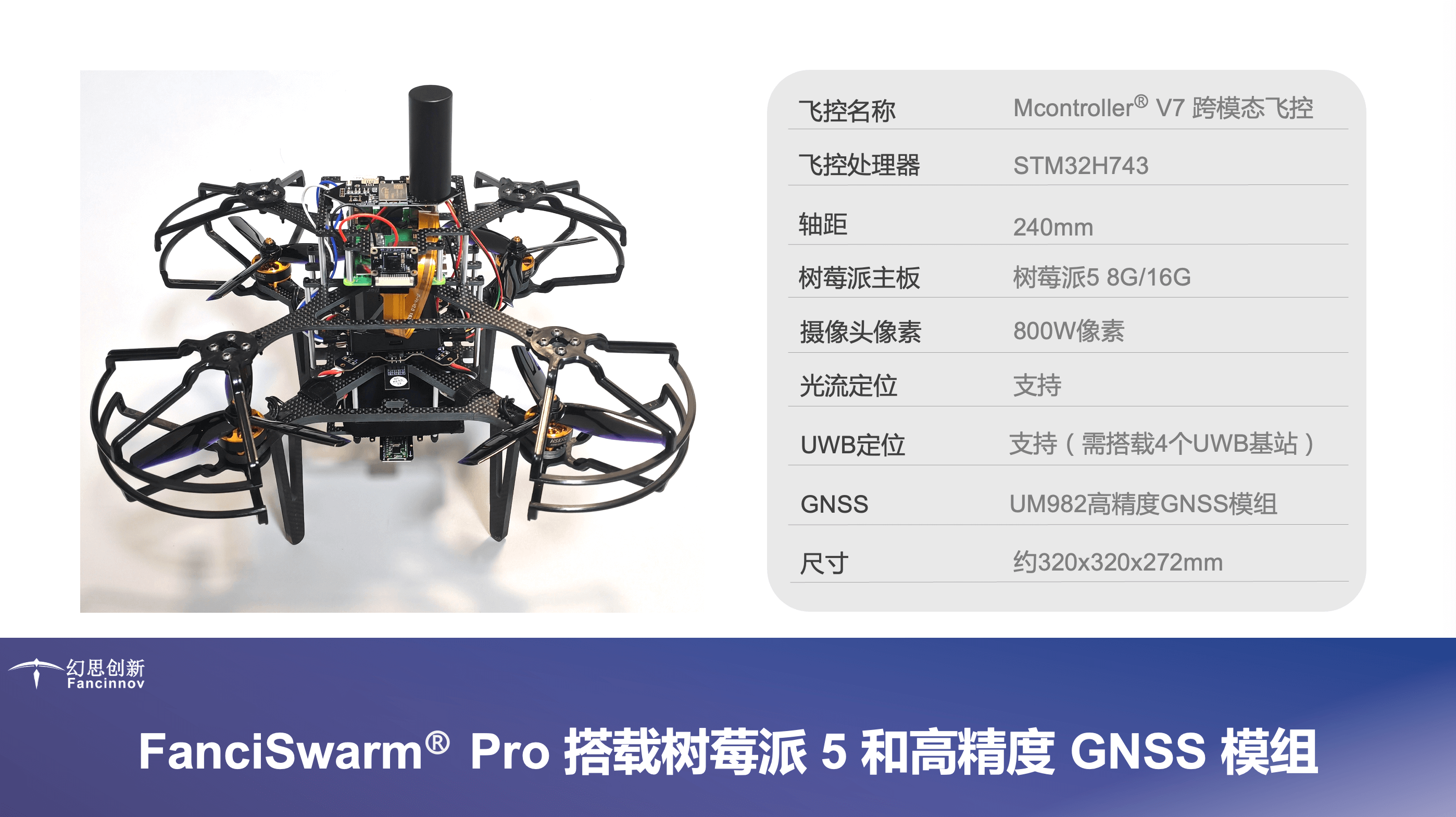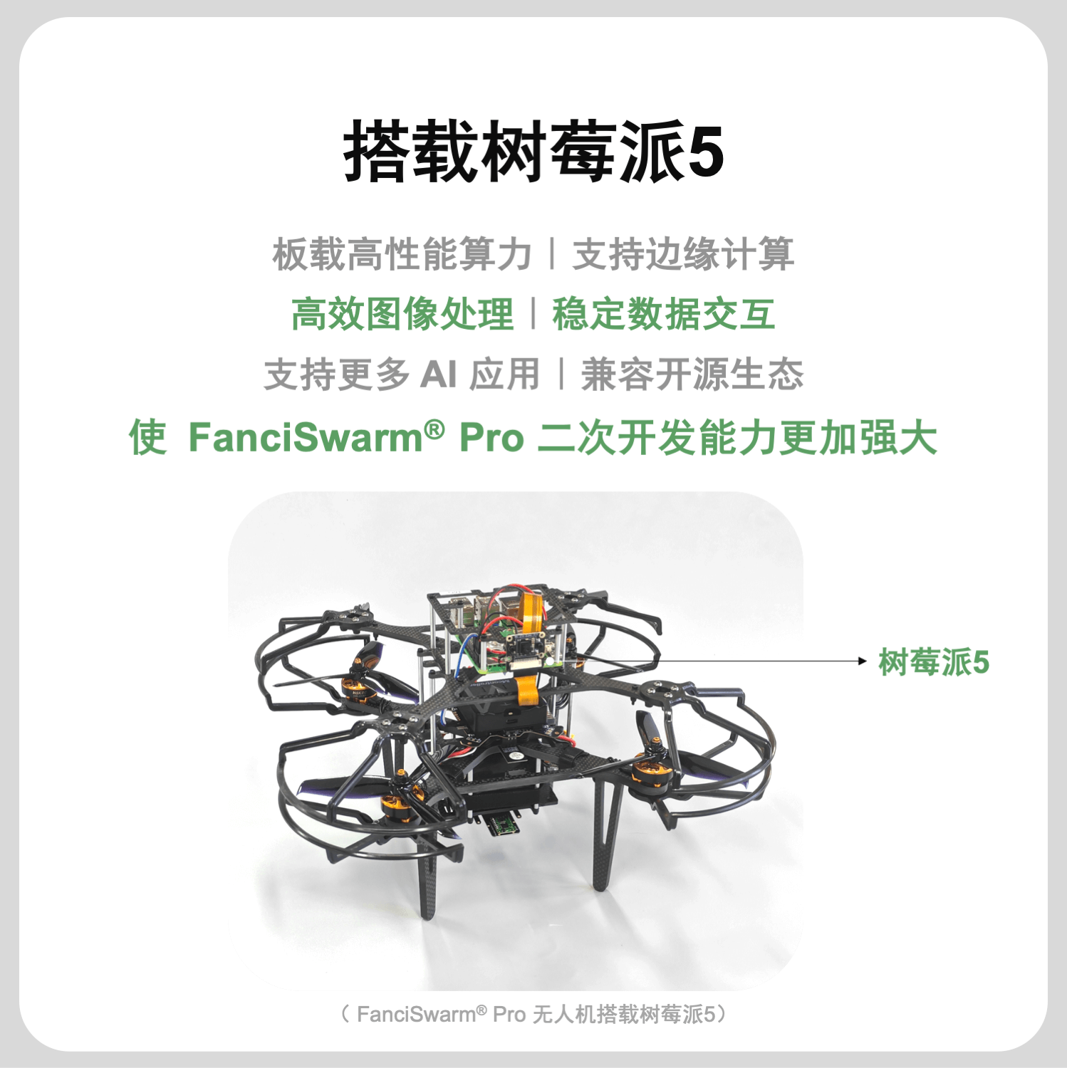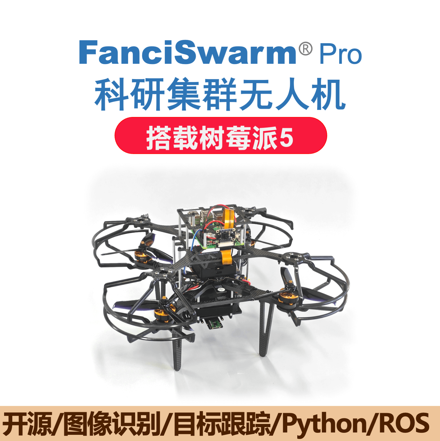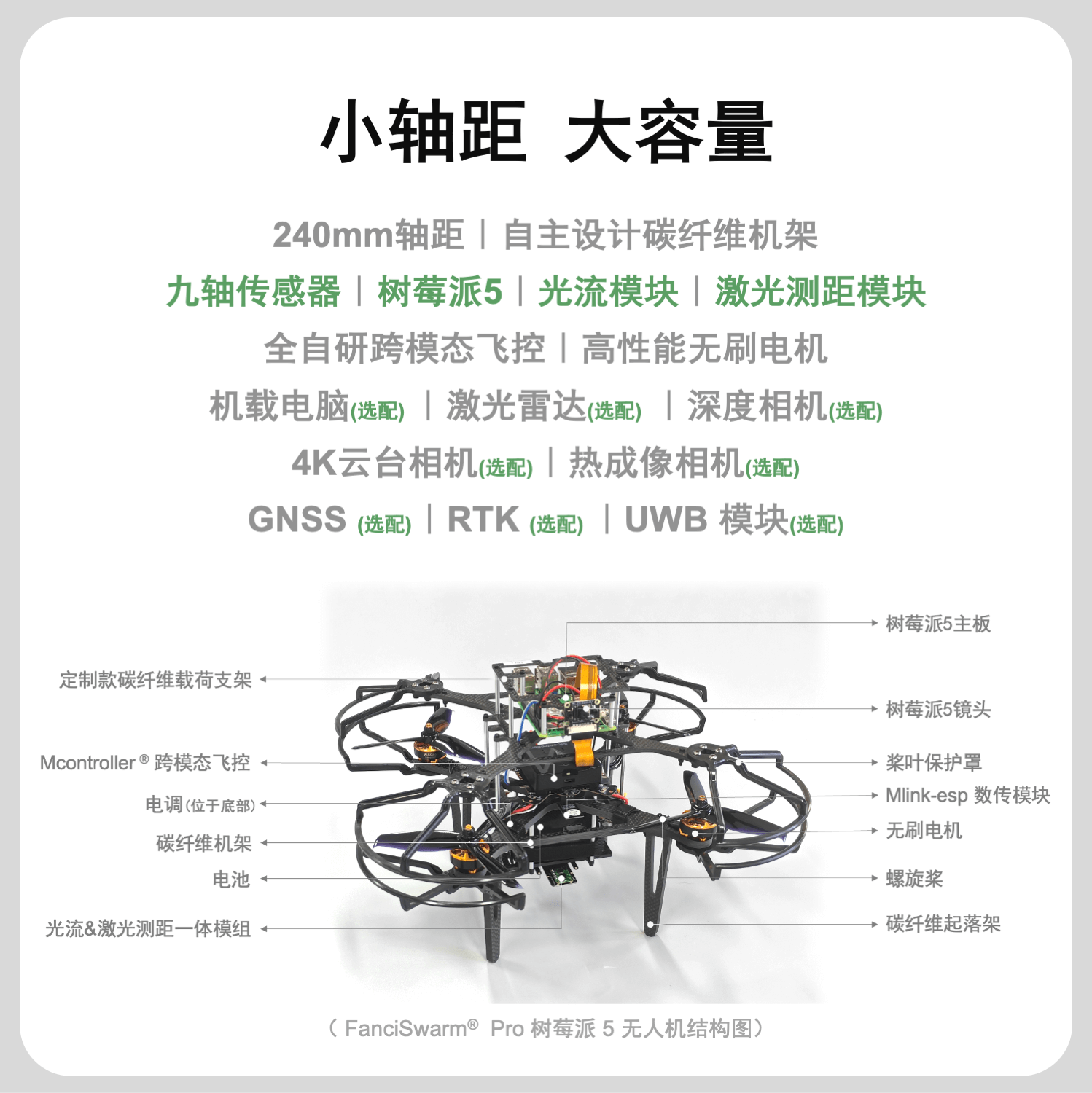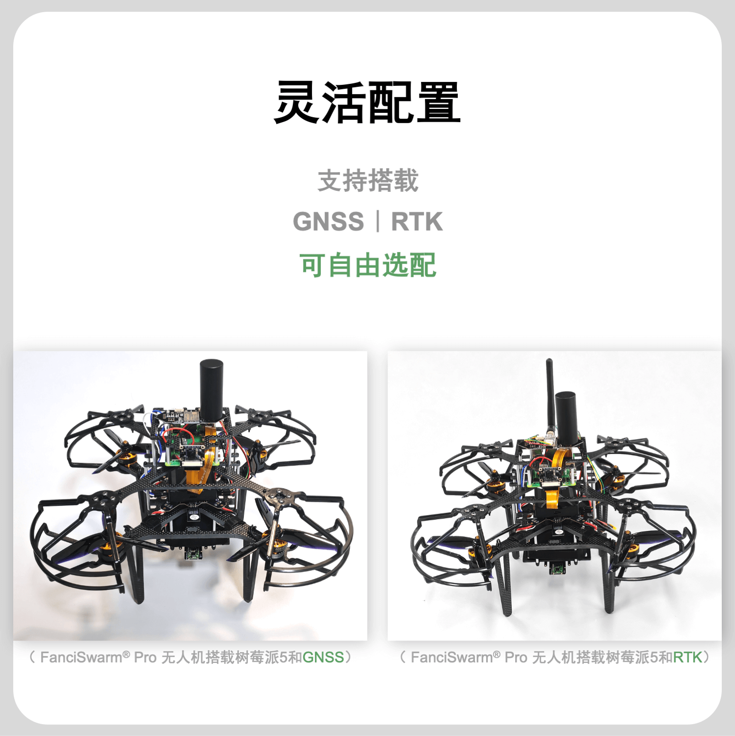 构成:由FanciSwarm® Pro 科研集群无人机、树莓派 5 定制款碳纤维支架、定制款碳纤维保护框、树莓派 5 主板、配套摄像头、GNSS(选配)、RTK(选配)构成,调试安装好,整机发货。