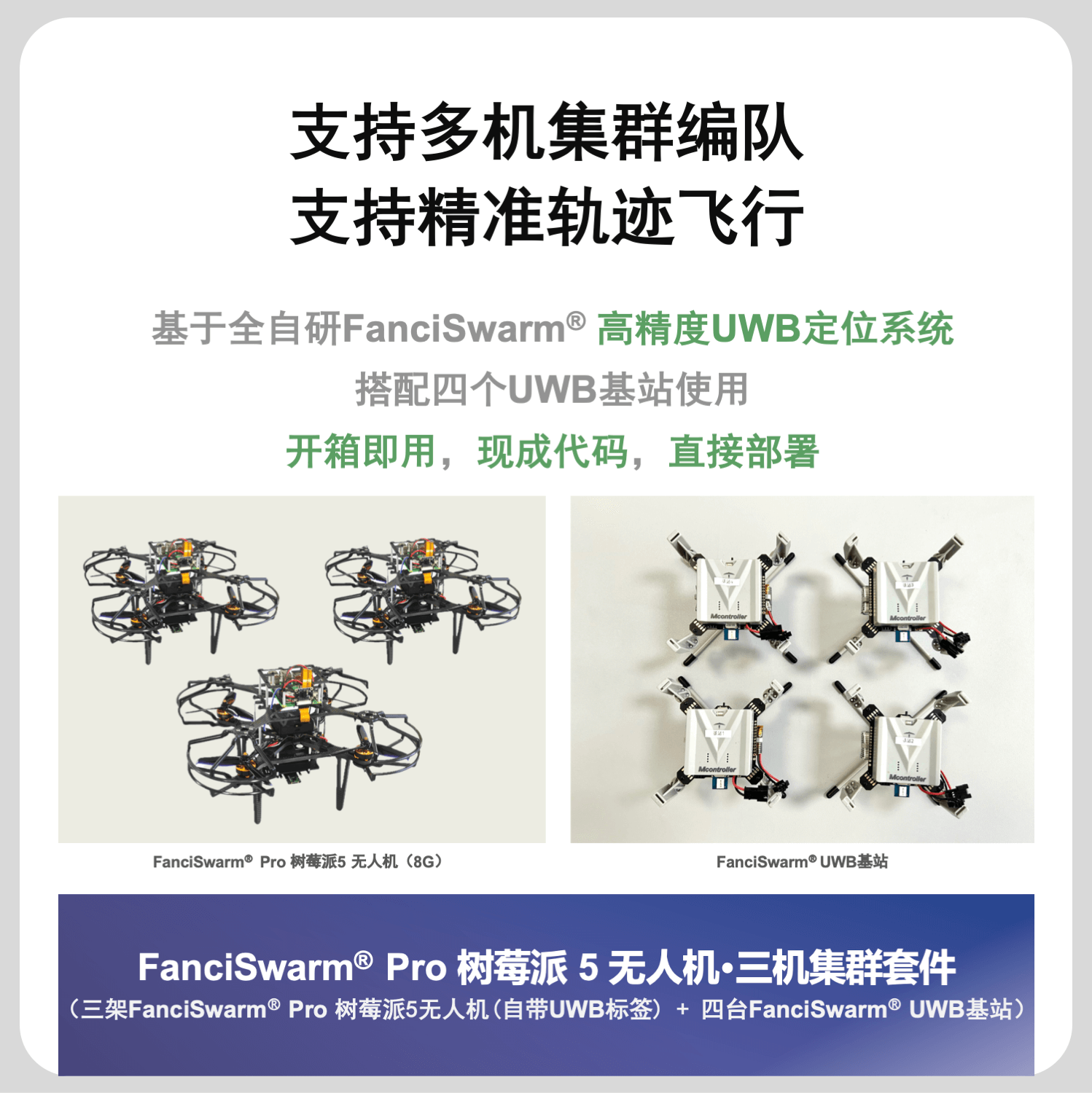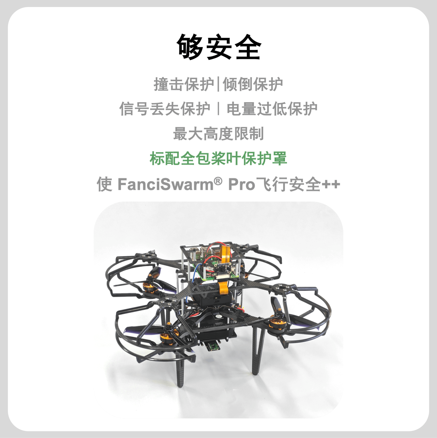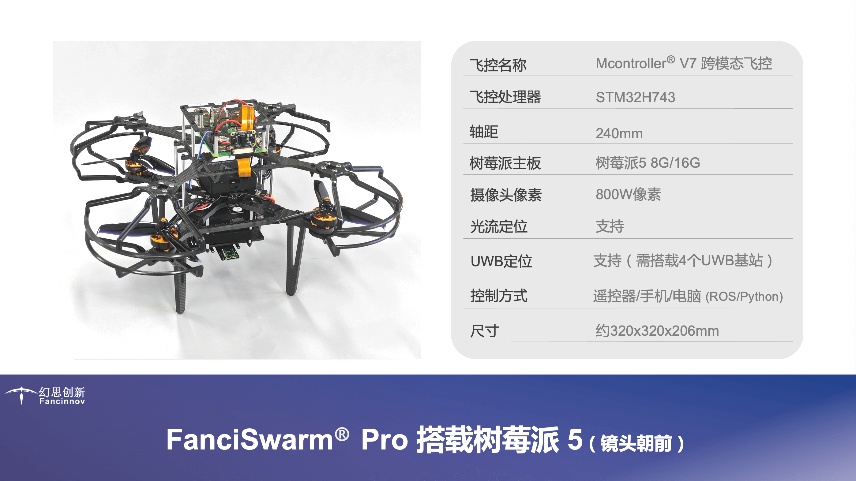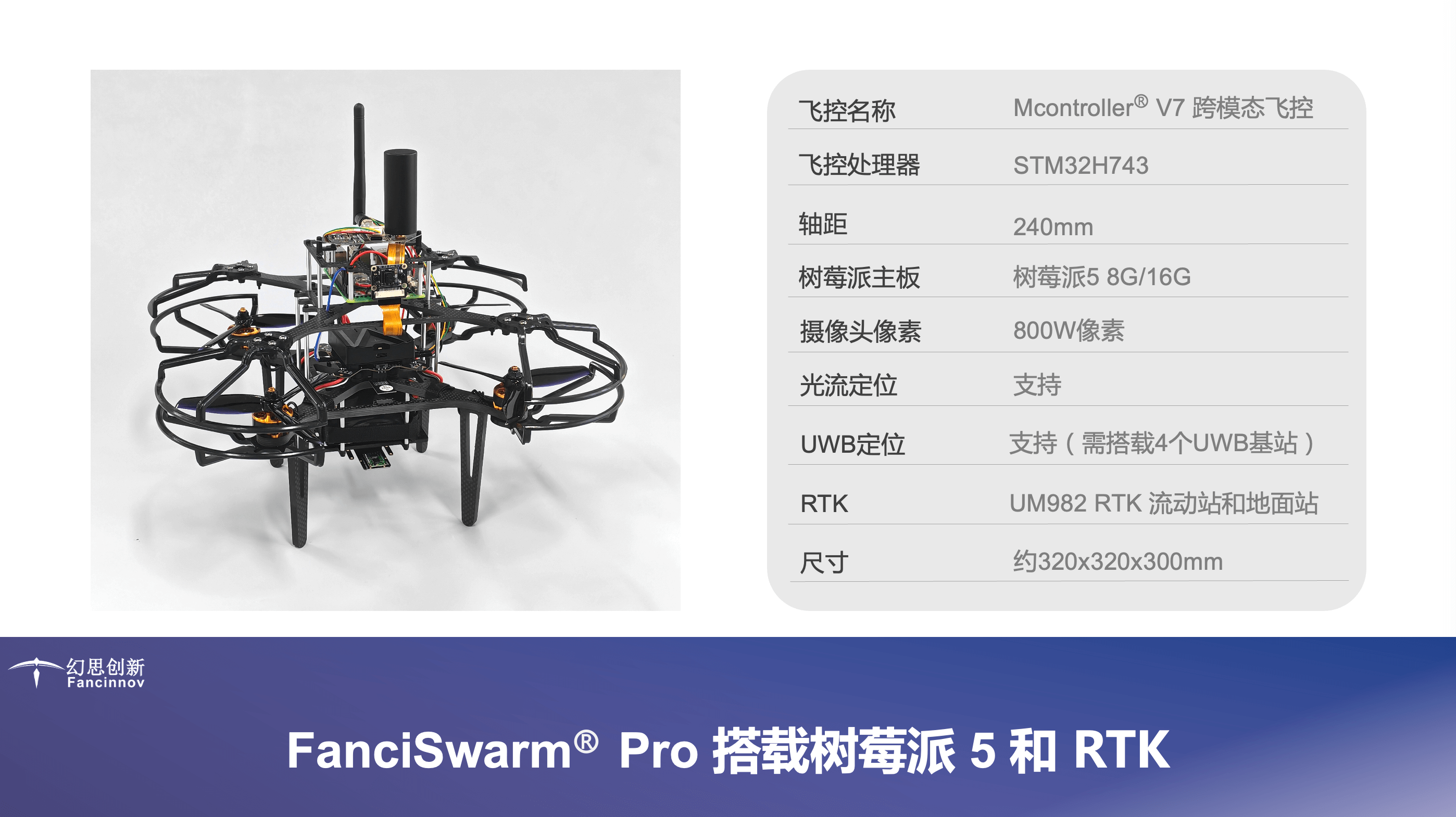 构成:由FanciSwarm® Pro 科研集群无人机、树莓派 5 定制款碳纤维支架、定制款碳纤维保护框、树莓派 5 主板、配套摄像头、GNSS(选配)、RTK(选配)构成,调试安装好,整机发货。