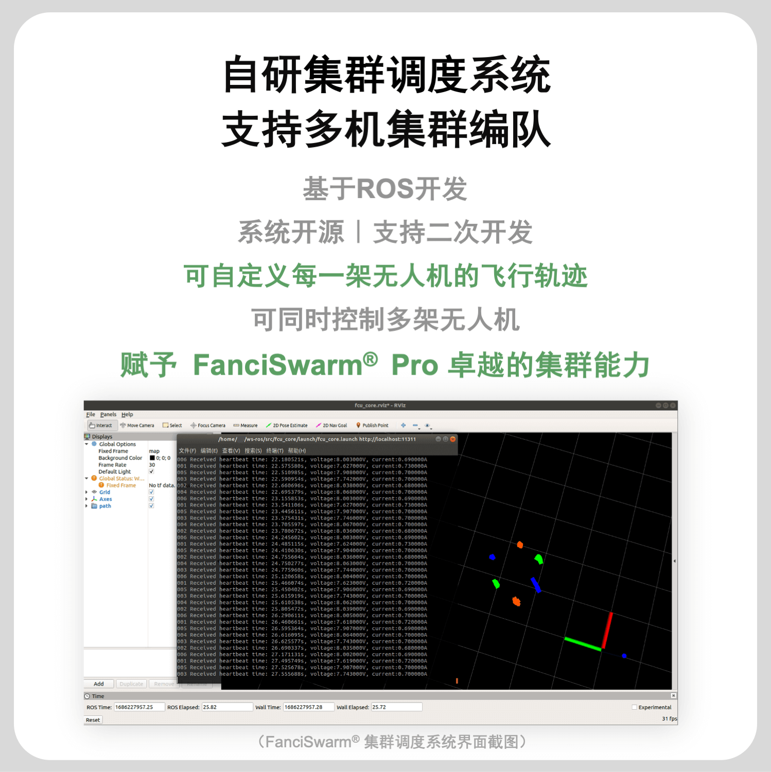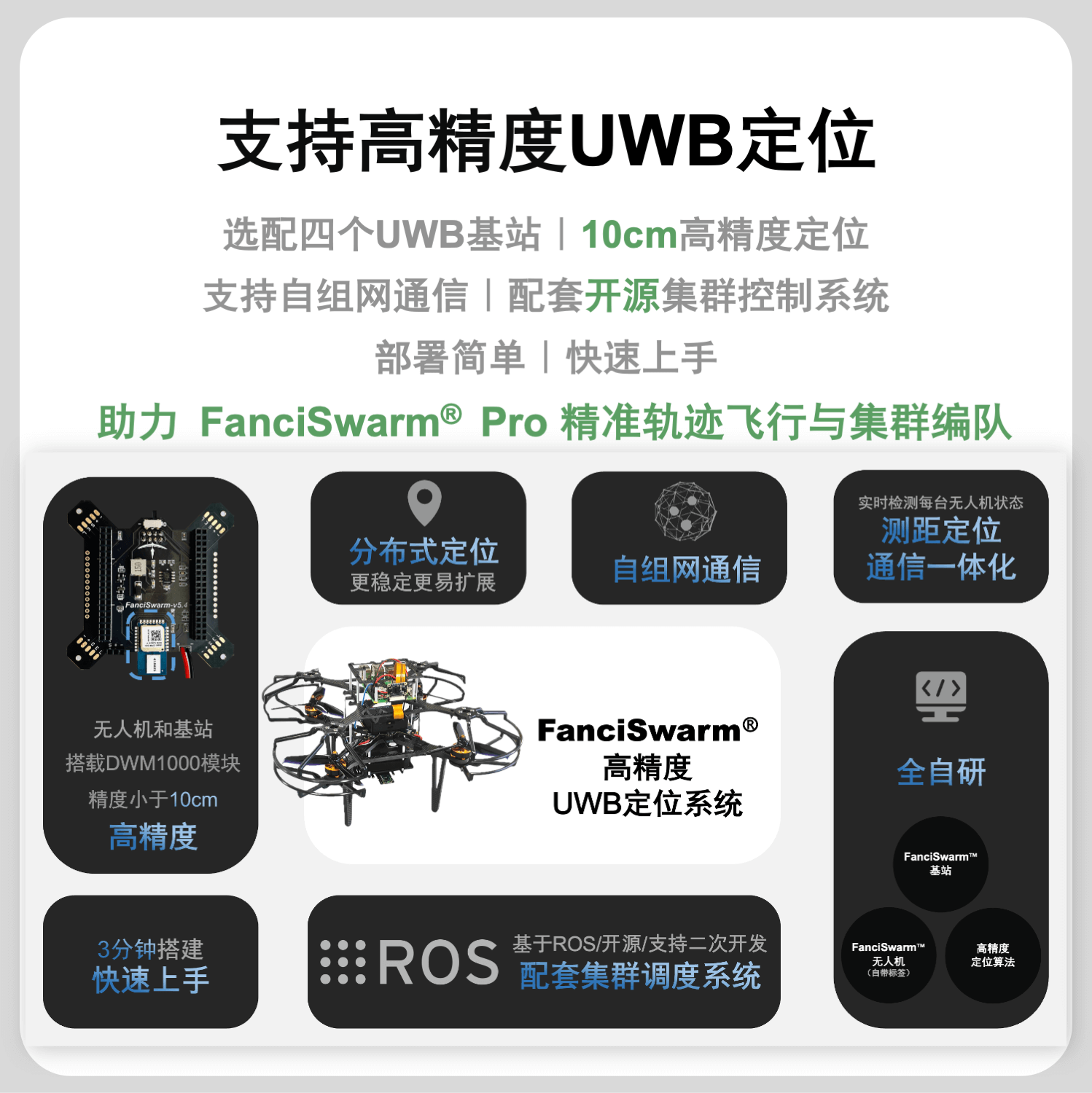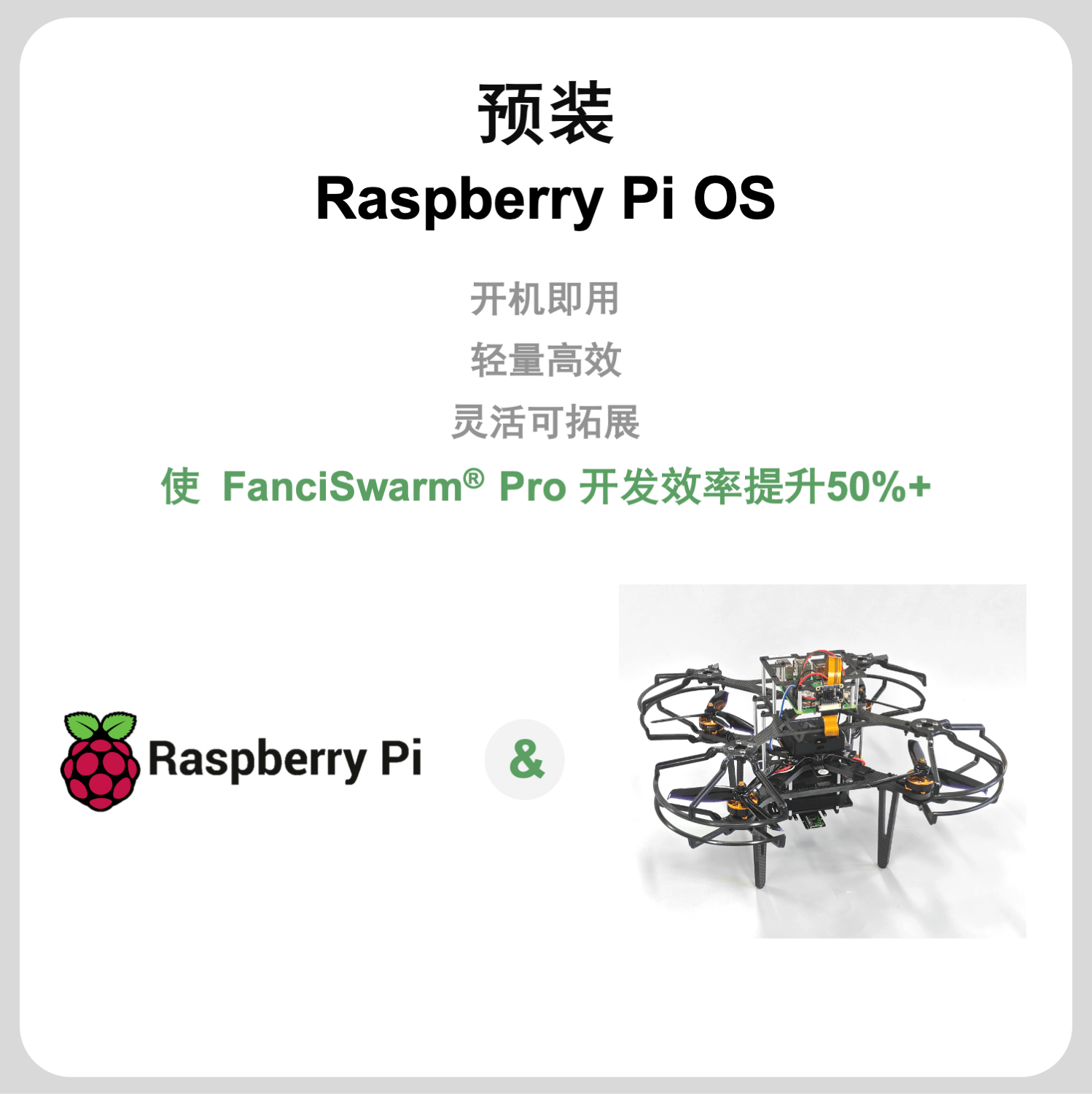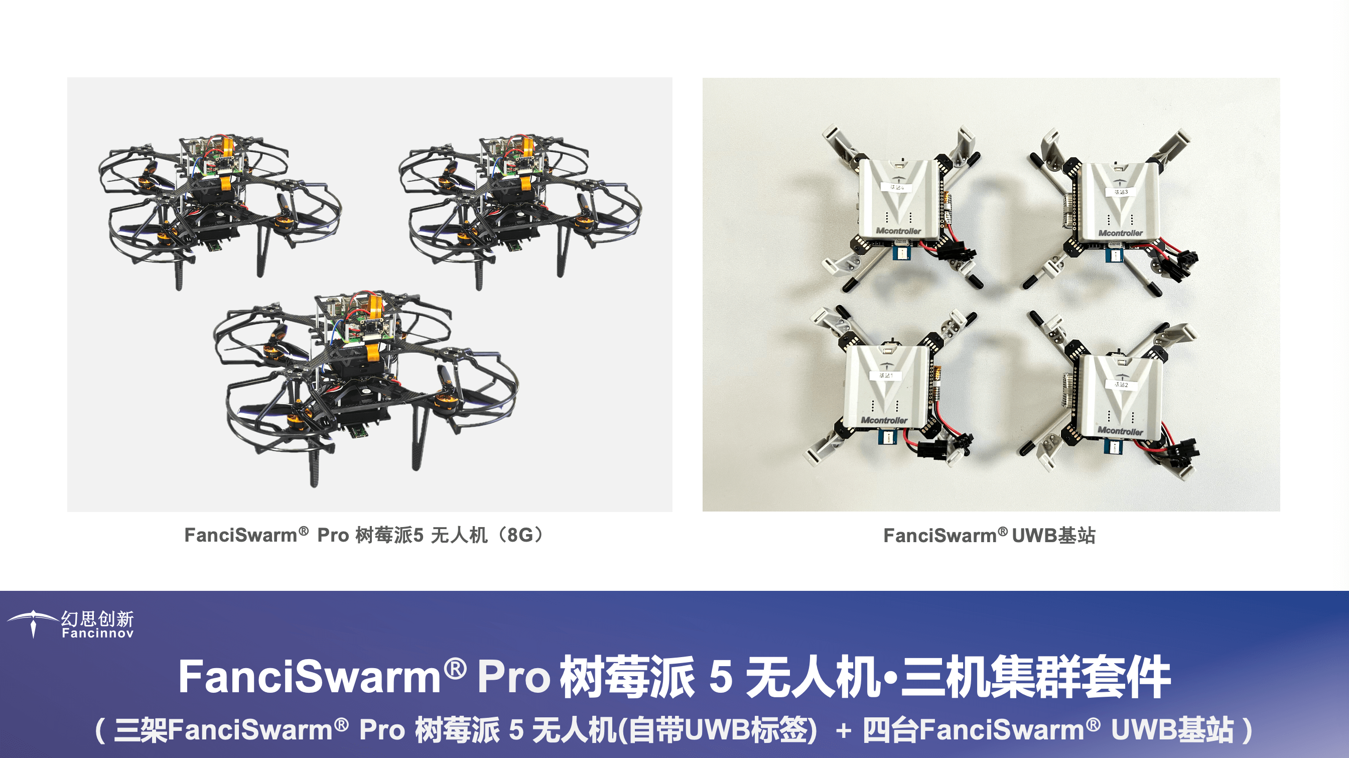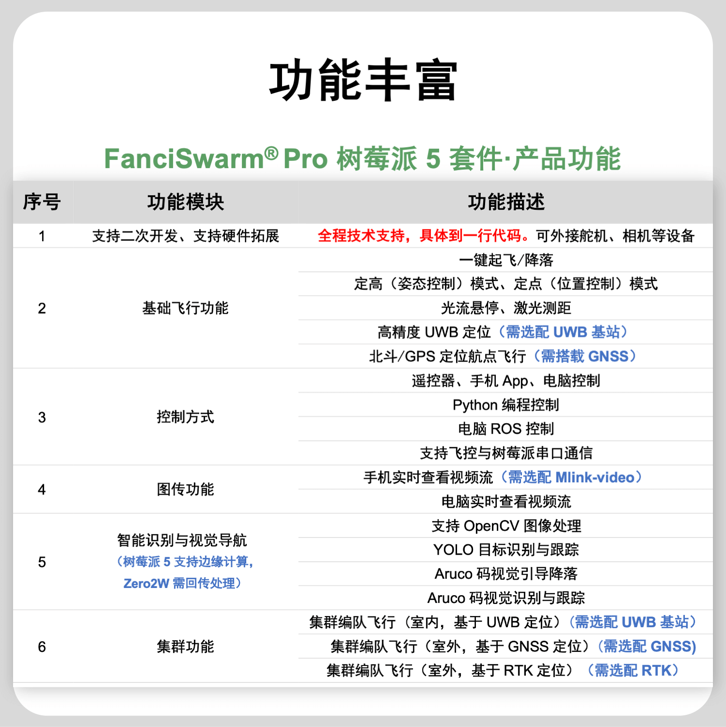 构成:由FanciSwarm® Pro 科研集群无人机、树莓派 5 定制款碳纤维支架、定制款碳纤维保护框、树莓派 5 主板、配套摄像头、GNSS(选配)、RTK(选配)构成,调试安装好,整机发货。