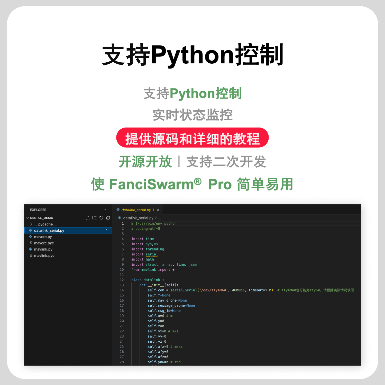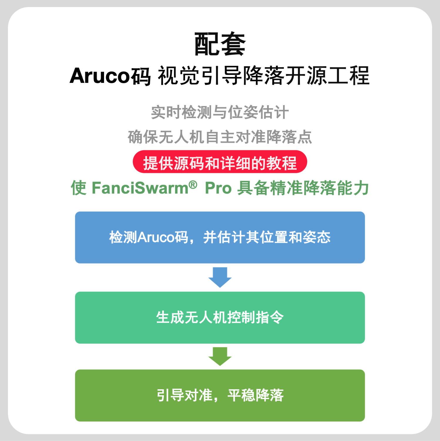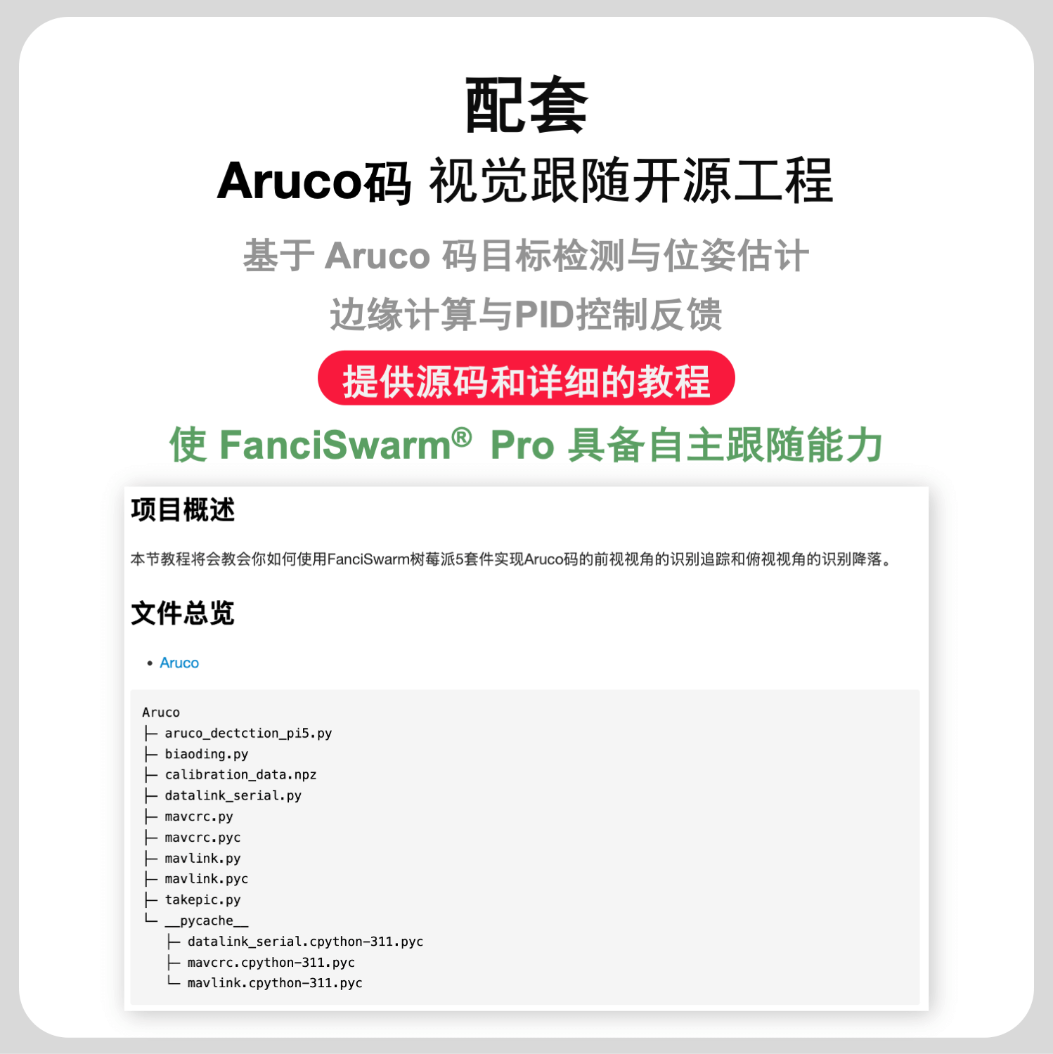 功能:FanciSwarm® Pro 树莓派 5 套件支持二次开发,配套完整的无人机智能感知与导航实例源码,支持Python控制,支持边缘计算,可实现图像识别、YOLO目标检测与跟踪、Aruco码视觉引导降落等功能,可胜任智能巡检、智能跟随、环境监测等多种应用场景。
