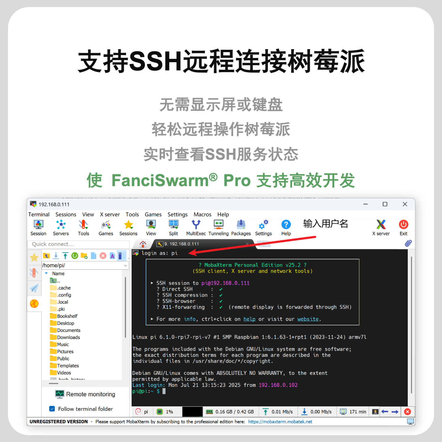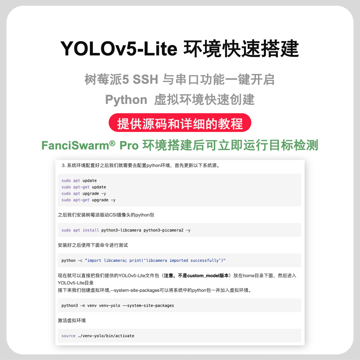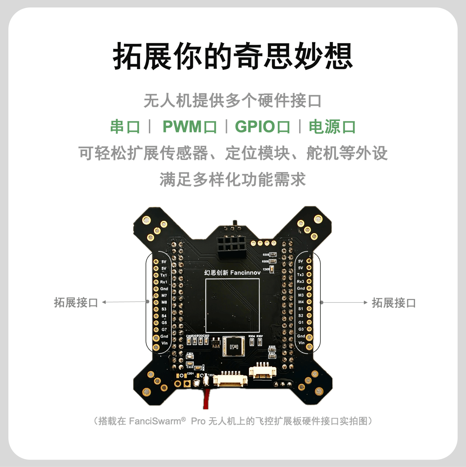 是什么?FanciSwarm® Pro 树莓派 5 套件,作为FanciSwarm® Pro 科研集群无人机技术的延伸,巧妙地借助专为该应用设计的树莓派 5 支架系统,轻松集成树莓派 5 主板及其配套摄像头,从而为FanciSwarm® Pro 无人机提供了先进的智能感知和导航能力。同时,摄像头模块的设计兼顾了多种视角需求,支持朝前以捕捉前方视野,或朝下以监测下方环境,极大地扩展了无人机的应用范围和功能性。