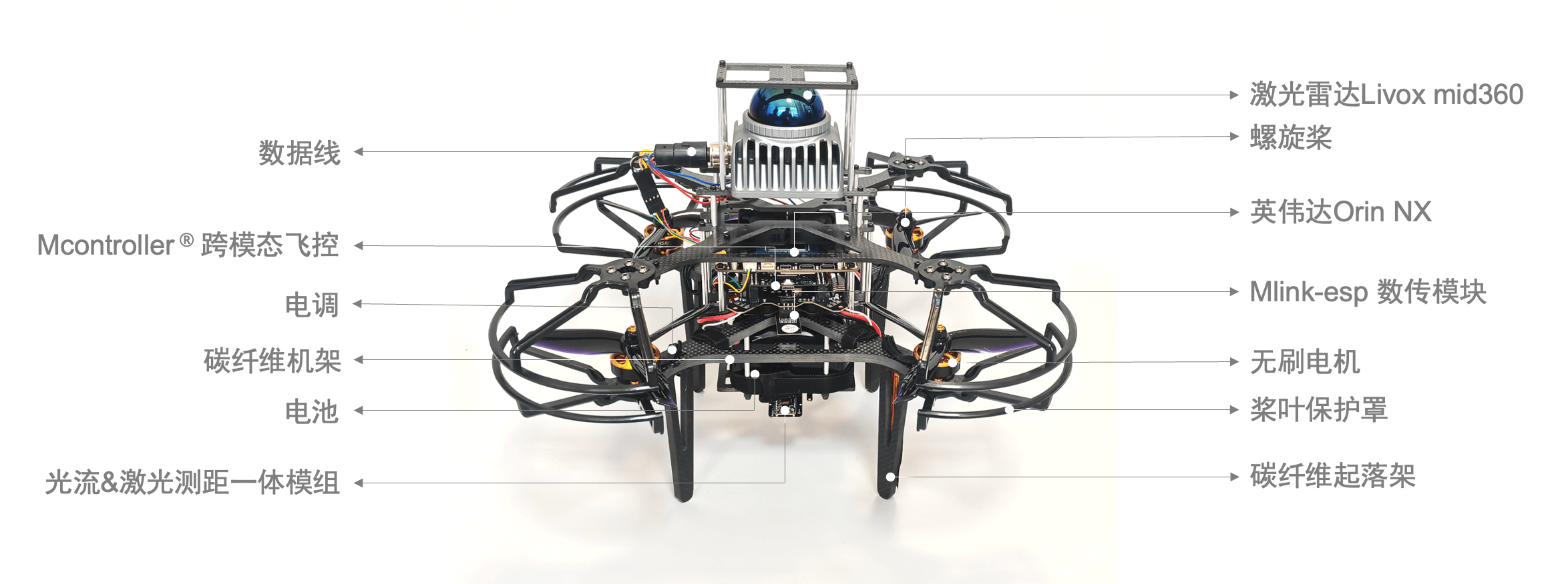 构成:由FanciSwarm® Pro集群无人机、定制款碳纤维载荷支架、碳纤维保护框、Orin NX或者Orin Nano核心板以及底板、激光雷达Livox mid360、深度相机D435(选配)、单目RGB相机(选配)、高精度GNSS模组(选配)、512g固态硬盘、散热风扇等构成,调试安装好,整机发货。