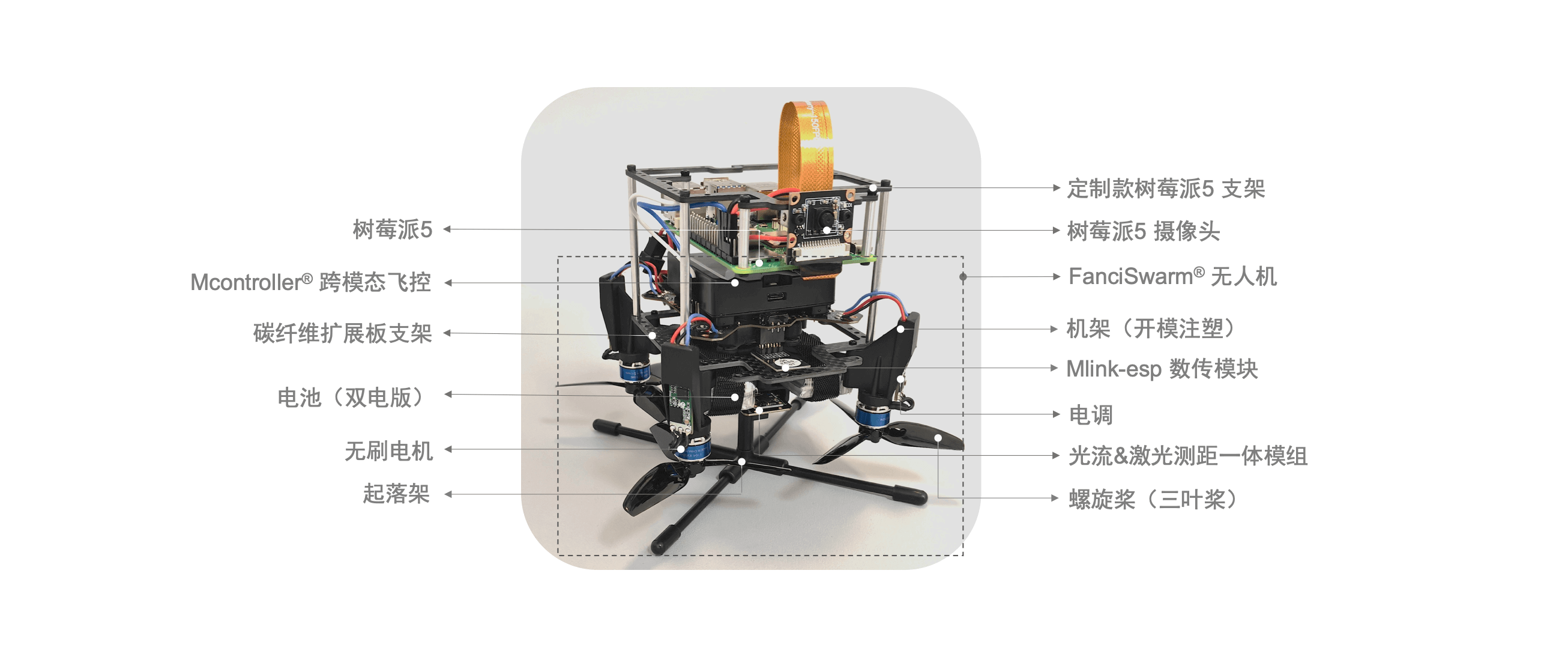 FanciSwarm® 是一款基于全自研的Mcontroller® 跨模态飞控开发的多功能微型集群无人机,专门用于集群、教育和科研。它既可以零开发到手即用,又可以进行简单开发解锁轨迹飞行、集群飞行等更多功能,还可以进行深度开发接入其他硬件实现更多创意。